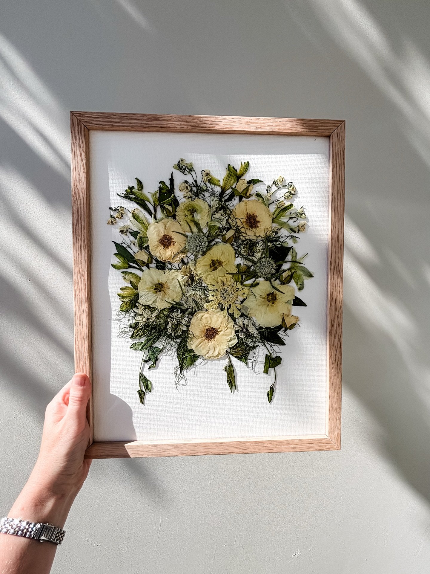 If your bouquet is already dried, we can frame your flowers in a different style here.